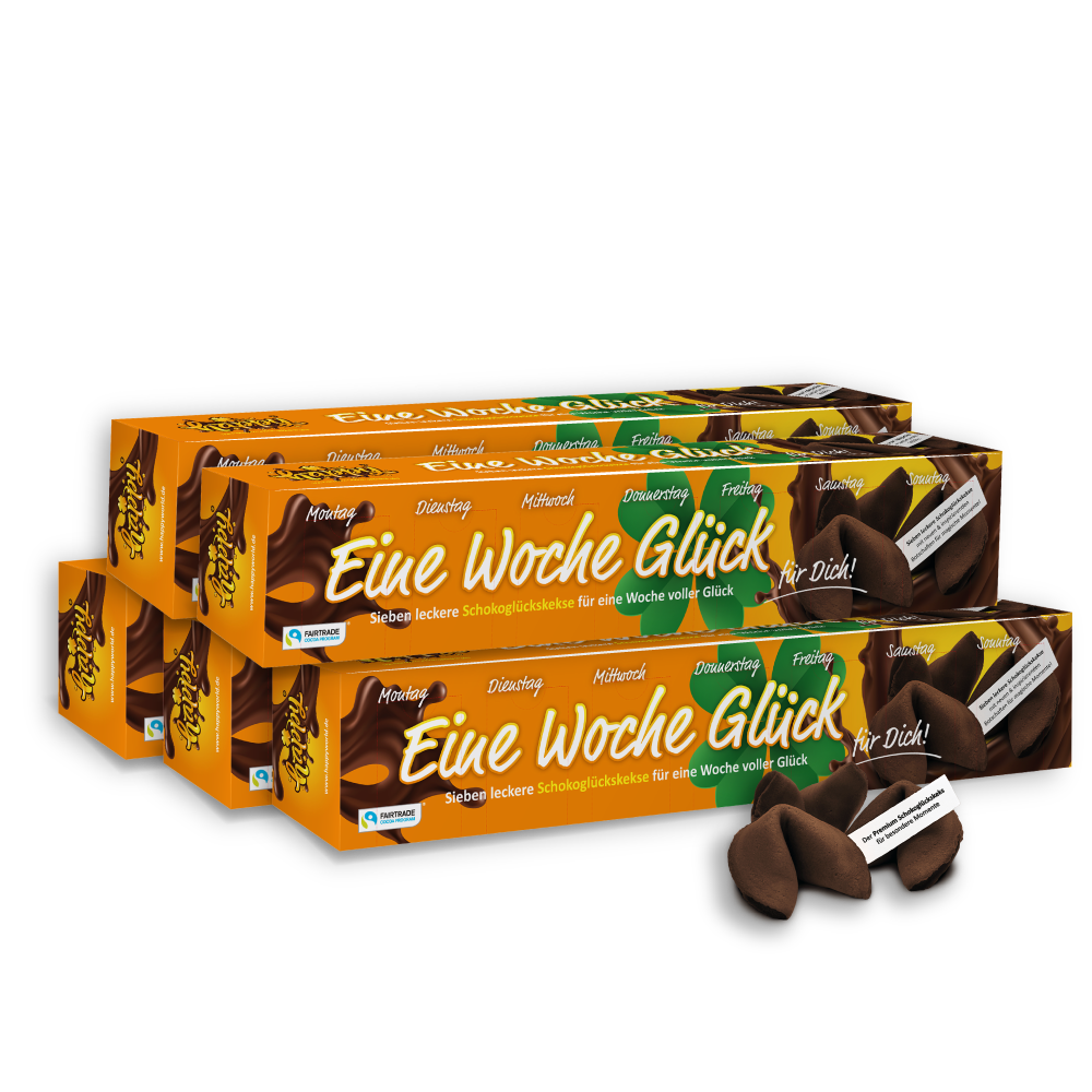 Sieben Türen, sieben Schokoglückskekse, sieben mal Glück und jeden Tag ein Highlight: Erlebe Schokoglückskekse mit feinstem Fairtrade-Kakao und inspirierende Botschaften in der praktischen Box Eine Woche Glück. Jetzt im 5er-Vorteilspaket noch mehr sparen! Be happy!