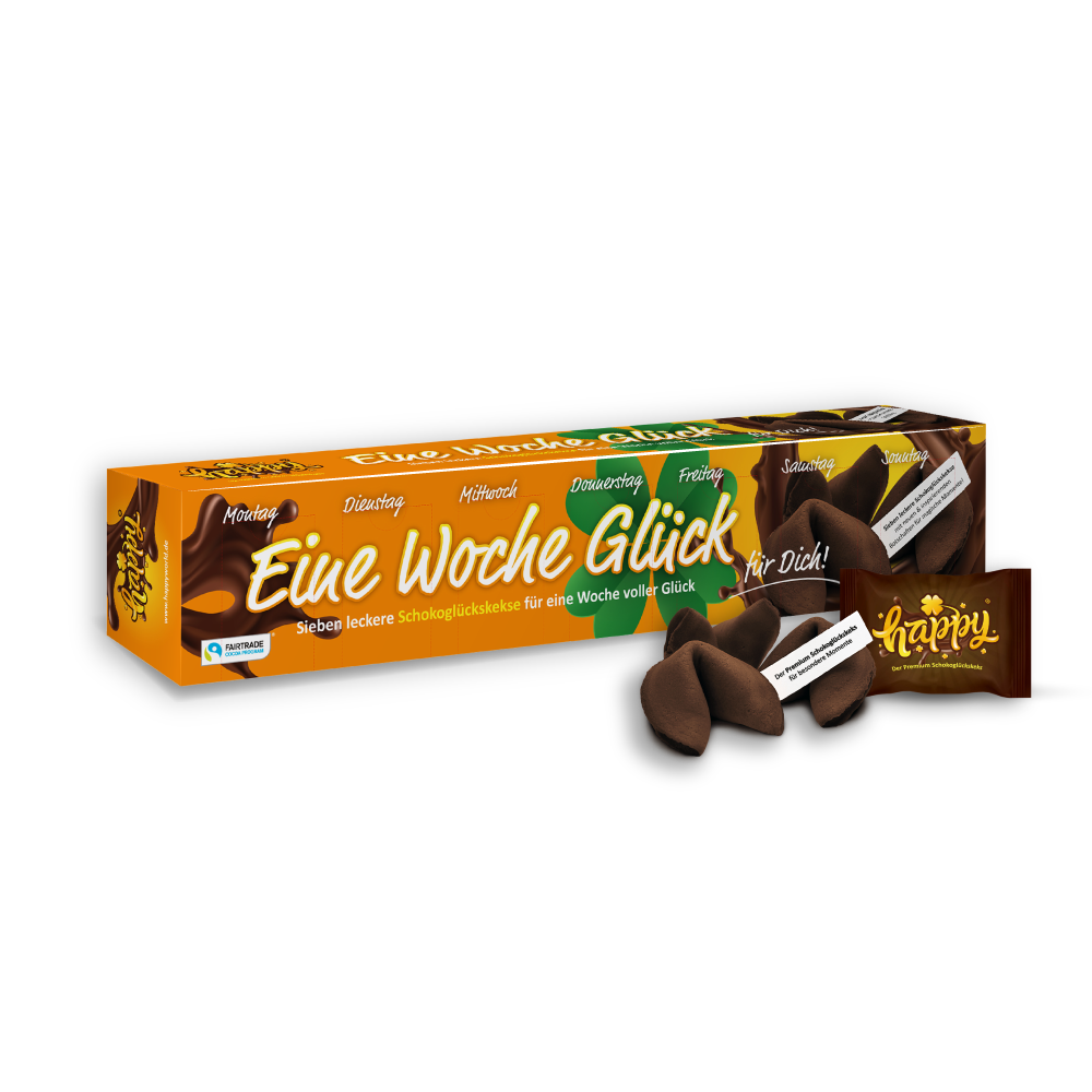 Werde Glückskeks-Fan mit unserer Happy Glückskeks Starterbox! Happy Keks, das sind Schokoglückskekse aus Premium-Schokolade inklusive liebevoll verfassten Glücksbotschaften im Inneren. Speziell für Verliebte haben wir uns außerdem etwas ganz Besonderes ausgedacht: Die Happy in love! Produktlinie. Für Verliebte, Verheiratete, zum Mutter-, Vater- und Geburtstag das ideale Geschenk. Mit Happy Kidz begeistern wir zudem unsere kleinsten Freunde mit Spiel, Spaß und Schokoglückskeksen in der bewährten Happy-Qualität.